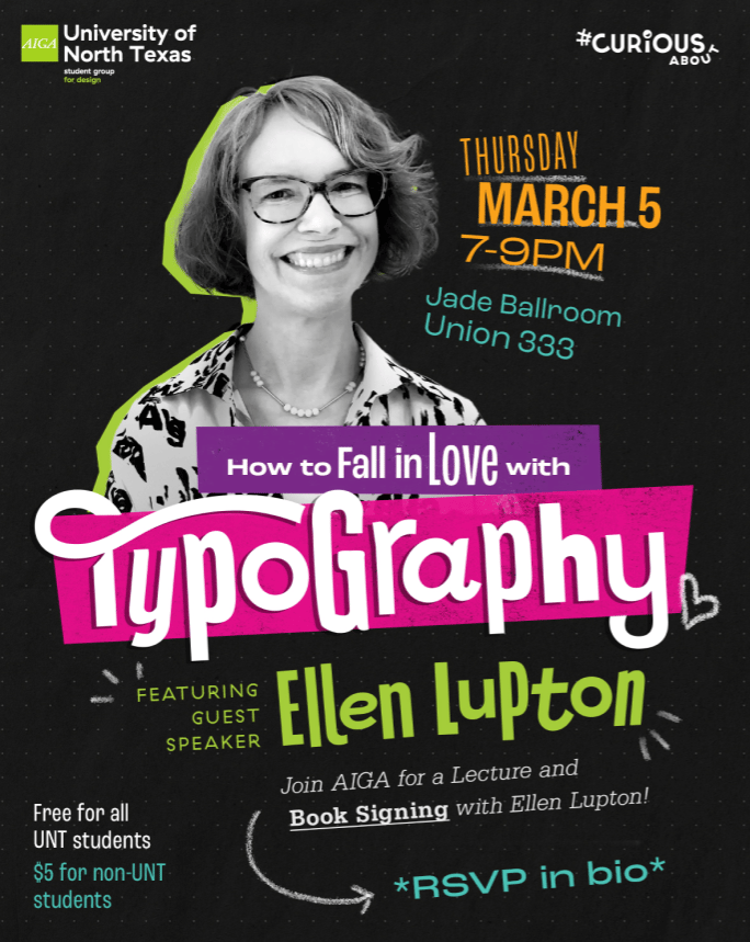 ![]() Ellen Lupton Workshop Join Ellen Lupton on Mar. 5th from 3-4 pm in Rm 365. Participants will explore the science and aesthetics of scent. They visualise a unique scent using hands-on art materials, then scan their artwork and create a unique package design. | ![]() How to Fall in Love with Typography: Ellen Lupton Join UNT AIGA for an inspiring lecture with renowned designer, educator, and author Ellen Lupton. There will be a speaker presentation, book signing and Q&A! Save the date for Mar. 5th 7-9 pm at the UNT Union’s Jade Ballroom, Rm 333. |